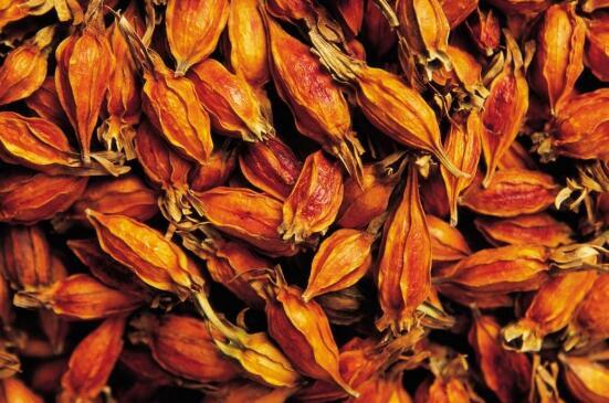 干燥果实长椭圆形或椭圆形,长1~4.5厘米,粗0.6~2厘米。表面深红色或红黄色,具有5~8条纵棱。顶端残存萼片,另一端稍尖,有果柄痕。果皮薄而脆,内表面红黄色,有光泽,具2~3条隆起的假隔膜,内有多数种子,粘结成团。种子扁圆形,深红色或红黄色,密具细小疣状突起。浸入水中,可使水染成鲜黄色。气微,味淡微酸。以个小、完整、仁饱满、内外色红者为佳。个大、外皮棕黄色、仁较瘪、色红黄者质次。