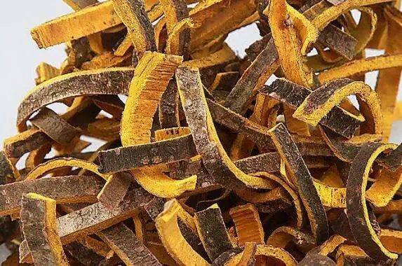 又名:关柏、关黄柏。为植物黄柏的干燥树皮。呈稍弯曲的板片状,边缘不整齐,长宽不一,厚约2~4毫米。栓皮留存或已剥离,栓皮较厚,表面灰白色;栓皮剥离者,表面棕黄色,平坦或有抽皱及皮孔;内表面灰黄色。质较松,易折断,断面纤维性,淡黄色稍带绿。气微,味苦。粉末遇水即带粘性,并使水染成黄色。以片张厚大、鲜黄色、无栓皮者为佳。